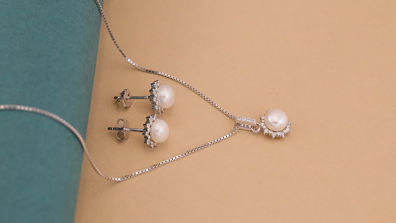 Embrace celestial charm with the Pratham 925 Sterling Silver Sun-Kissed Pearl Pendant Set. Centered around a radiant faux pearl, each piece is encircled by a shimmering halo of high-grade white cubic zirconia, mimicking the ethereal glow of the sun. The set includes a matching pendant and earrings, expertly crafted in certified 92.5% sterling silver for lasting durability and elegance. With its soft lustre and refined sparkle, this pendant set is a versatile accessory perfect for traditional celebrations, formal evenings, or daily sophistication. Hypoallergenic and tarnish-resistant, it ensures comfort with every wear. Whether it's a thoughtful gift or a personal indulgence, this set comes hallmarked and packaged with a Certificate of Authenticity and warranty—an exquisite statement of quality and style.